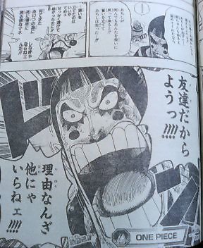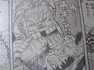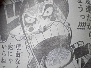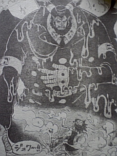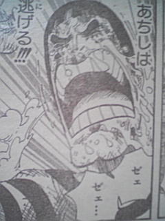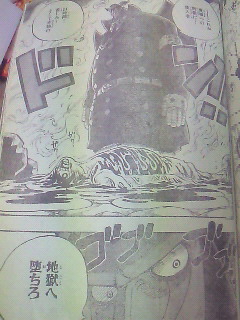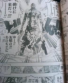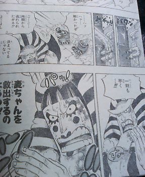 ハンニャバルの方を選んだバギーとMr.3・・・ 結果はハンニャバルの圧勝!! ハンニャバルはわざと通して署長責任にしたかったらしいのだが二人が向かって来たので闘わざるおえなかった・・・ 一方ボンクレ 泣きながら逃げるボンクレ・・・ 敵う道理がないとか考えてる・・・ 一方マゼラン対ルフィ ルフィが毒で悲鳴をあげる マゼラン:「・・・おれにヒザをつかせようとは・・・・・」「追い詰められたネズミは怖いものだ・・・!!!」「だがその手についた毒で充分・・・お前の身体機能を奪ってゆく・・・」 ルフィの手が溶ける・・・ ルフィ:「ハァ・・・ハァ・・・!!ハァ゛ゴムゴムの゛・・・」 マゼラン:「激痛だろう気の毒に・・・!!!」 ルフィ:「゛ツイン゛」 と同時にマゼランが息を吸う マゼラン:「゛毒フグ゛!!!」 ルフィ:「゛JETピストル゛!!!」 JETピストルをマゼランの腹に当てた直後口から玉状の毒がでる・・・ ルフィがかわし背後に回る マゼランが反応しヒドラをだす・・・ マゼランの方に再びJETピストル!!! ルフィの手がヒドラにあたり毒が弾けとびルフィに当たる・・・ ルフィ:「ん!?ゲホゲホ」「霧!?」 マゼラン:「゛毒・雲゛」 後ろに蜘蛛の形をした霧の塊が現れる! ルフィが目をこする・・・ マゼラン:「目が霞むか・・・?」「耳がおかしいか・・・?」「両手はもう使えまい」「毒はやがて」「お前から全てを奪う」 ~一方エース~ エース:「オイ!!!看守!!!」「本当の事を答えろ・・・」「・・上で何か起きてるだろう・・・・!!!」 看守:「・・・いやァ何も」 ウソをつく看守・・・ 一方 ルフィが暴れるようにマゼランの方をけるが当たらない・・・ マゼラン:「恐ろしい精神力だ・・・」 ルフィが力の限り当てようとする 手に火が当たる ルフィ:「熱ち・・・!!」 マゼラン:「もういいだろう・・・・・!?」 ルフィが暴れるのをやめとけていく・・・ マゼラン:「これが貴様への刑罰だ・・・侵入者」「24時間・・・苦しみ・・・そして本物の」 「地獄へ堕ちろ」 「・・・・これだけ重複した゛毒゛に・・・」「解毒の術はない・・・!!」 ルフィ:「エ―・・・・ス・・・・!!!」 マゼランが兵隊に言う・・・ マゼラン:「やがて死ぬが・・・・放っておいても邪魔だろう」「レベル5の中央塔へぶち込んでおけ!!」 兵士:「マ・・・マゼラン署長!!」「レベル3への通路前で・・・不手際があった模様で」 マゼラン:「何があった・・・」 兵士:「何があったかはまだ・・・!!」 一方~レベル5~ 囚人:「おい!!・・・おい!!」「ハァ・・・ダメだぁコイツ・・・」「・・・死んだかそれとも」「未来へ冷凍保存されたか・・・!!」 囚人の指が落ちる 囚人:「新入りが入って来たぜ・・・・!!」 囚人が話しかける・・・ 囚人:「・・・・・あ」「ああもうダメだありゃ・・・゛毒の刑罰゛を・・・」「すでにくらってやがる・・・」 一方 ~連絡通路前~ ハンニャバルたちが全滅している・・・ マゼランがハンニャバルを掴む いそいで謝るハンニャバル・・・ マゼランが兵士に全員レベル3に行くようにいう マゼランはそのままトイレへ・・・ ハンニャバルが二人を尋問するといい尋問部屋をあけろ二人は私が責任を持って預かると言う・・・ バギー:「ハァ・・・ハァ助かったぜ」 Mr.3:「拷問から逃れられたガネ!!よしころからどうする」 ハンニャバル:「決まってるじゃない急がなきゃ・・・!!!」 ハンニャバル:「一刻も早く・・・!!!」 ハンニャバルに化けたボンクレ:「麦ちゃんを救出するのようっ!!!」 途中からボンクレはハンニャバルに化けていた・・・ ルフィ救出を反対するMr.3とバギー・・・ ボンクレ:「犬死にだろうがカマ死にだろうがカマわねぇあちしはマゼランと麦ちゃんに背を向けた時すでに命を置いてきたのよう・・・!!」「あの場で共倒れになり捕まるよりも!!あちしが逃げて・・・麦ちゃんも命さえ留めてくれたなら」「あちしが死んでもあんたを救いに戻って来ると!!誓いを立ててあちしは走った・・・!!!」 バギー:「・・・誓いを立てたのはいいがてめぇせっかく逃げて助かったのに!!何でまたあいつの為に死に場所に戻るようなマネ ボンクレ:「友達だからようっ!!!!」 「理由なんざ他にゃいらねェ!!!!」 おしまいちくわ |