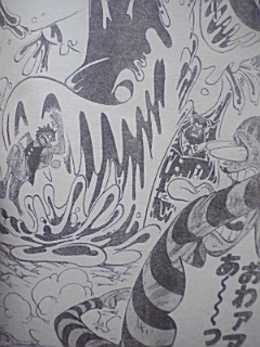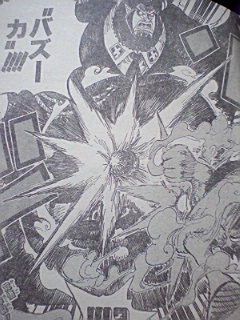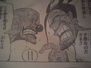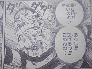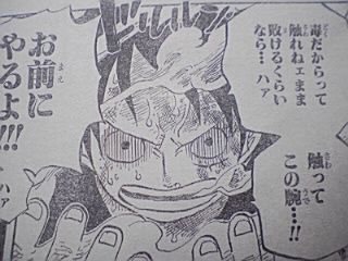 獄卒兵がマズイと言い逃げる ルフィ:「何だよもう少しでハァ・・・!!」「んまそうな匂いの場所に辿り着けるのに・・・・ゼェゼェ・・」 ボンクレ:「ム・・・麦ちゃん戦っちゃダメよーう!!!!」「そいつはインペルダウン監獄署長のマゼラン!!!゛ドクドクの実゛の能力者なのよう!!!」 ルフィ:「ドクドク・・・・?」「毒か!」 マゼラン:「いかにもそうだ・・・麦わらのルフィ・・・!!!」 ボンクレがルフィに逃げるように言う マゼラン:「無駄だ・・・」「このフロアからの脱出口は全て押さえてあるのだ!!!貴様らの逃げ場などすでにない!!!」 マゼラン:「゛ヒドラ゛」 ルフィ:「・・・・何だコレ・・・全部毒か!?」「毒の塊か!!?」 逃げる二人・・・ ボンクレ:「ヒドラの毒は麻痺性の神経毒全身に死ぬ程の痛みが回ってやがて死ぬのよう!!!」 ルフィがマグマの上にある拷問具的なものを掴んで言う ルフィ:「ついて来てみろ」「う熱ちゃちゃちゃちゃ!!!」「熱っちィ~!!」 ヒドラの頭の一つがマグマに突っ込む・・・ ルフィ:「やった!!首いっことれた!!」 マゼランが口で何かシャボン玉みたいなのを作る・・・ しかもそれを勢いよく吐き出した・・・ それはルフィの方へ飛んでいく・・・ マゼラン:「゛クロロボール゛」 ルフィ:「えっ?」 ルフィの近くで爆発 間一髪逃げるルフィ・・・ だがルフィの回りにガスが舞う・・・ 獄卒共:「ガスマスクをつけろ!!」「中央には近づくな署長が戦闘中だ!!」 囚人:「゛催涙くしゃみガス゛!!?」「くそマゼランの毒ガスだ!!」「何でこんなところで戦ってんだよ!!エッキシ!!相手は誰だ!?」 ルフィ:「へっきし!!!あで?ふぇっキシ!!ブェッキシ」「何だ!?・・・目が痒い涙が出る!!」 ルフィは戦いにくくなった ヒドラの動きがとまる マゼラン:「ベノムロード」 マゼランがヒドラを伝わりルフィの元へくる・・・ マゼランの手には突起状のものがとりついている・・・ その腕でルフィに攻撃 ルフィは何とかかわす・・・ つづくマゼランの突き 岩が溶ける さらにマゼランが突く ルフィは足で軌道をそらす だが落ちるルフィ ゴムゴムのスタンプで何とかマグマに落ちずにすんだ・・・ 一方隠れてるボンクレ ボンクレは泣きながら思う ハンニャバルのところから逃げる作戦だ・・・ マゼラン:「まだ大人しく捕まる気にはならんか・・・?」 ルフィ:「・・・・」 マゼラン:「!?」 ルフィ:「゛ゴムゴムの゛ォ」 「゛JET゛」「゛バズーカ゛!!!!」 内容終わり 意外とルフィやばいかもしれませんね^^ でもまったく予想がつかないぜぃ^^ おしまい